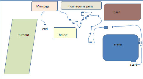This crude, hastily penned (pixeled?) diagram is nowhere near to scale, nor does it have all of the trees, buildings, pens, paths, logs, obstacles, vehicles, etc. marked. But it gives you an idea of why our meander-stop-meander ride took 40 minutes to go a furlong. The stops, marked by solid rectangles, are guesses. We did not actually go that close to the mini pigs, either.