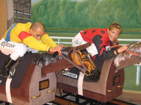 We rode an Equicizer, a mechanical horse that jockeys use to learn, rehab, and stay in shape. It was invented by jockey Frank Lovato, Jr. Therapeutic riding programs also use them to help clients develop physical skills and confidence before riding horses. We were in a Western saddle, so we didn’t get the full race training experience, but we could feel what a great tool this would be for any lesson barn. Like a bouncy horse for adults! Now if they’ll just invent a Big Wheel, we’ll be set.