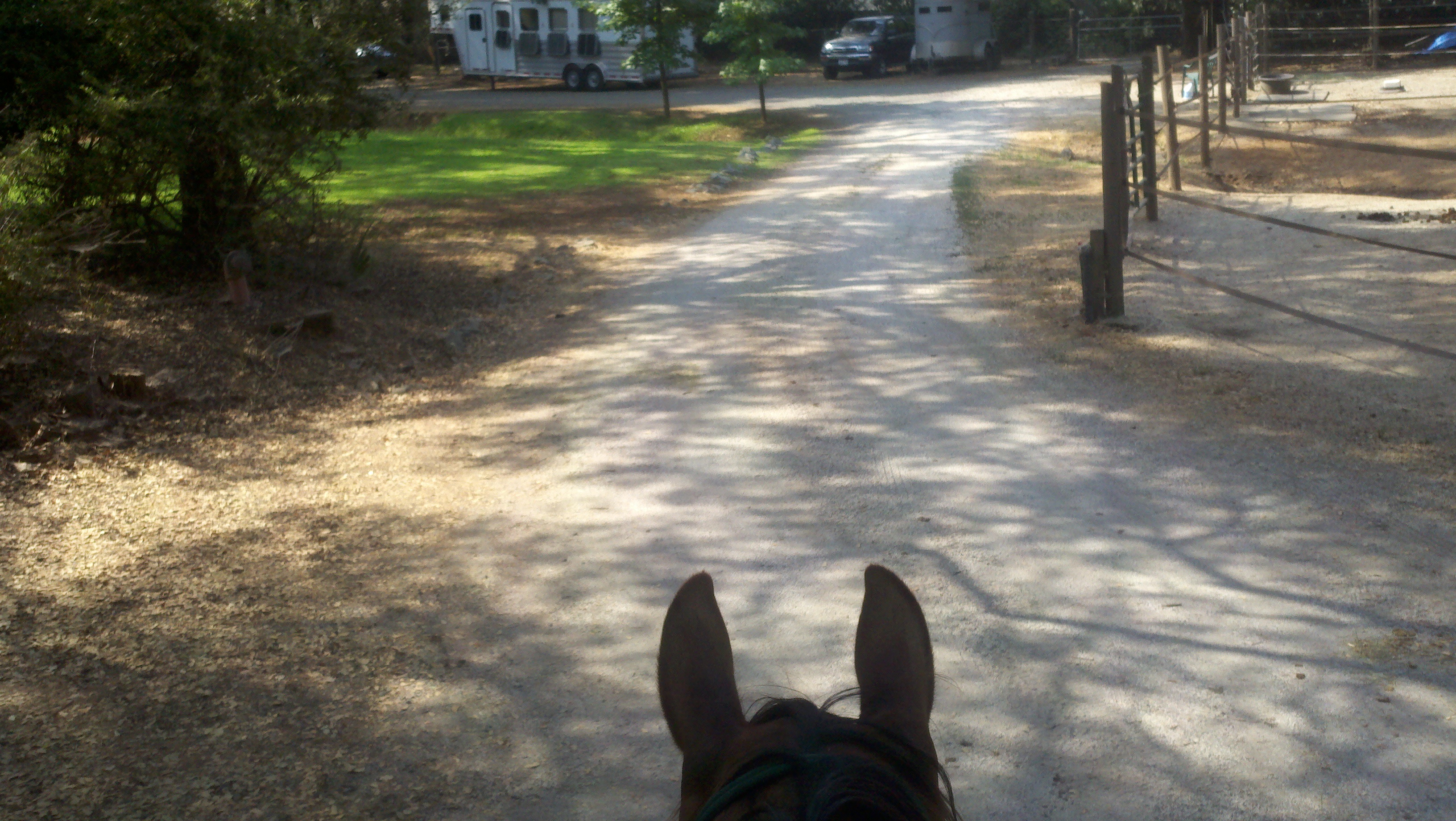 And I burst out laughing, because he was so transparent about it — glancing around and then doing a double-take at a tarp we had passed in this same direction several times today and on Sunday without his even giving it a glance. And then, I kid you not, he turned his head just enough to glance at me out of the corner of his eye. I told him “don’t be a dork” and he practically shrugged, and on we walked. My laughter reminded me to breathe which inspired me to sing and since Rocky loves it when I sing, we got smooth and found harmony! We added in some walk-trot-walk transitions at various landmarks along the way, which Rocky seemed to enjoy quite a bit. And since we had a nice long straight line for it, we had a pretty nice trot, all things considered.