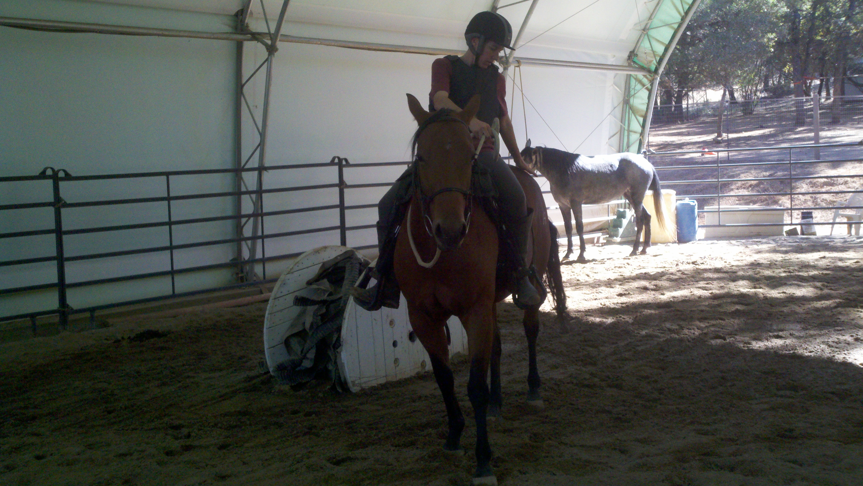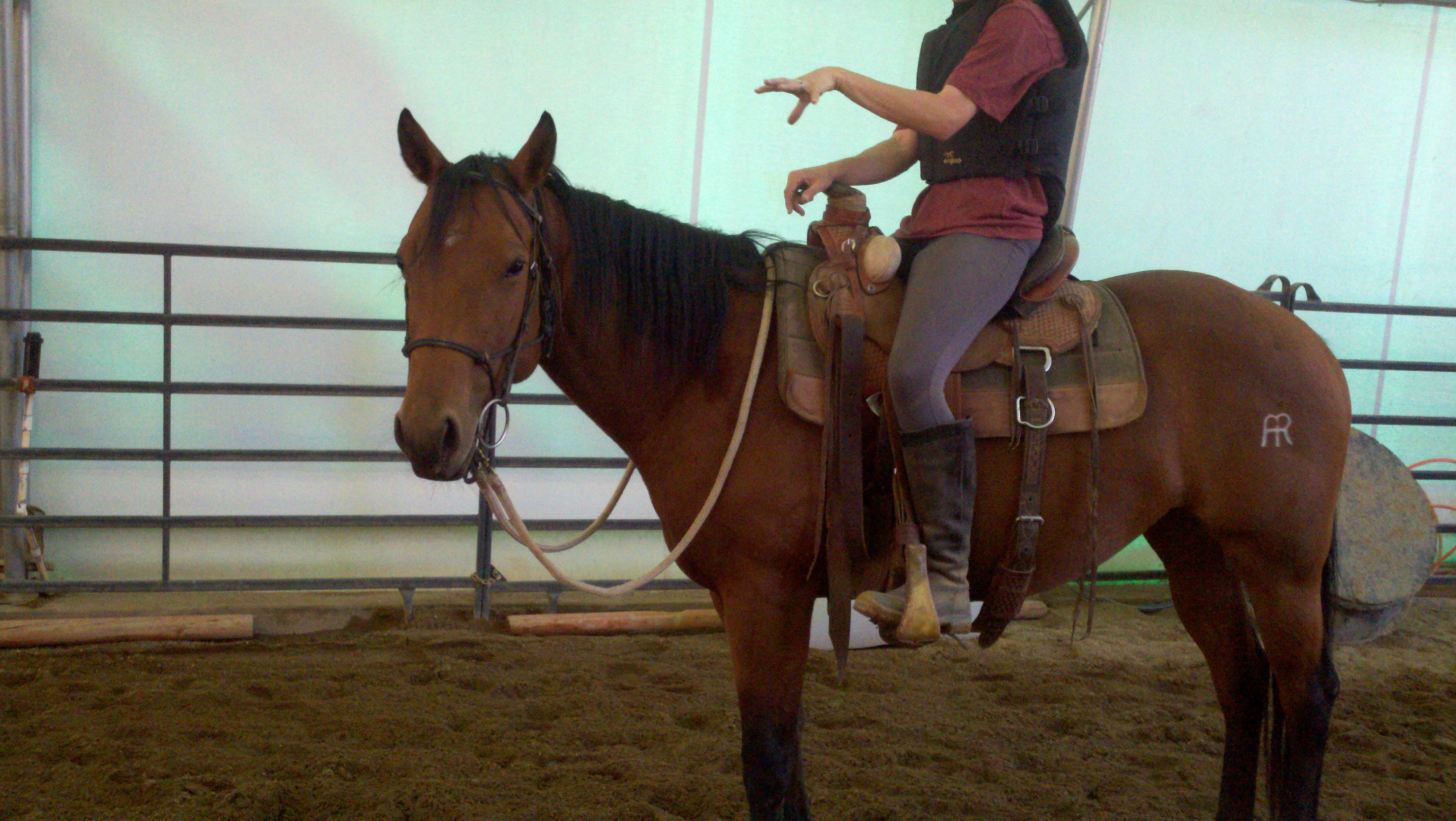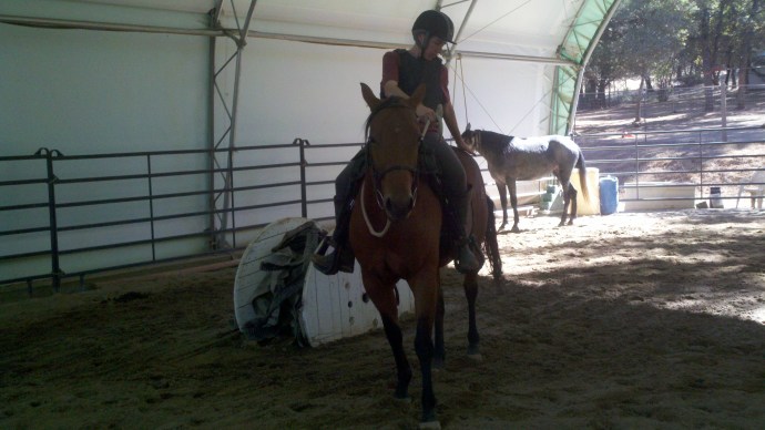 I helped Erin yesterday, adding a little bit of pressure from the ground to help River if she didn’t respond to the rider’s cues. Today, I went out there, but was not needed even one time. River is already going, stopping, turning, and backing based on cues from Erin in the saddle.