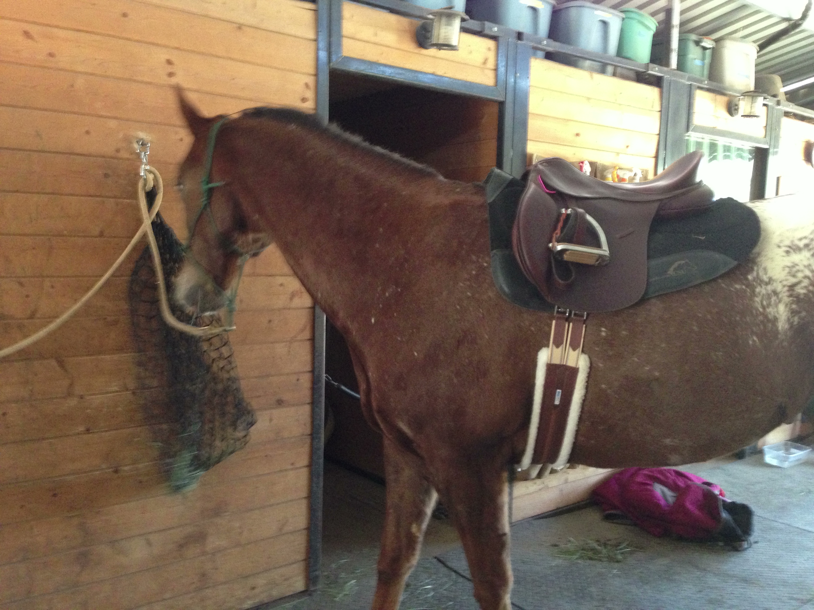 We have a nice new girth that has elastic on both sides; plus, it’s a little bit longer than the old girth, to fit Rocky’s new physique. He’s finally keeping weight on and looking more like a 6 or 7 on the vet’s body condition scale instead of a 3 or 4, and he is moving so much more comfortably and fluidly than he ever has. (We also borrow Erin’s CSI saddle pad, although I’m going to get one for us, soon.)