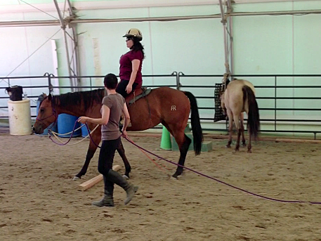 I played with her on the ground for about 90 minutes before it was our turn to be evaluated. We spent time grazing, played Touch-It, went over and around and through obstacles in the arena, and stood peacefully together watching the other mare’s fitting experience. When Susan came over to put the saddle on, River probably thought that it was time to go back to her pen. Instead, her adventure was just beginning.