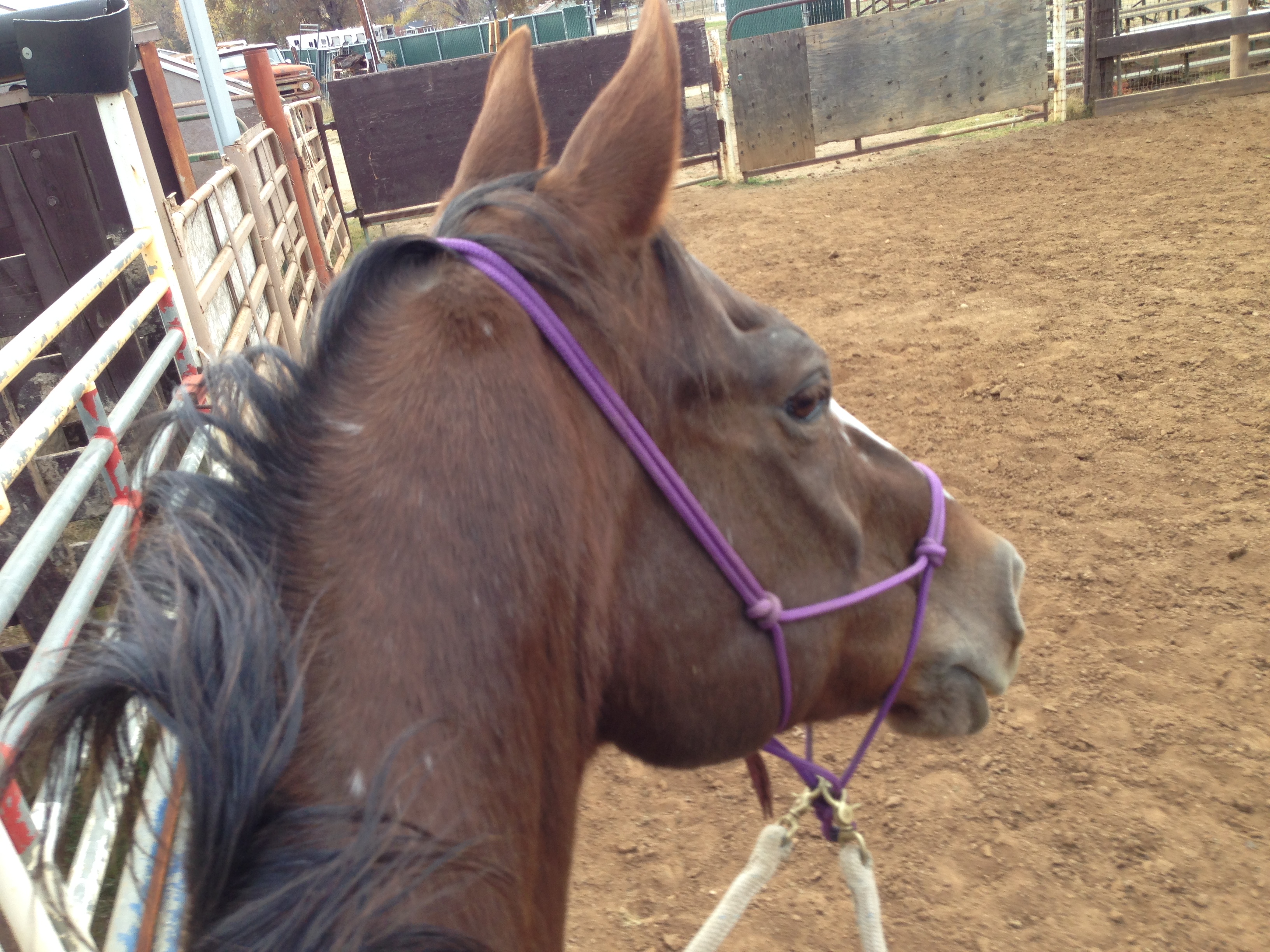 Last week I rode Rocky at the rodeo arena and found that with the bigger space he is much more able to follow the rail and walk in a straight line. I practiced walking and trotting the length of the arena, using a hindquarter yield to turn around with the nose to the fence, and walking or trotting back. Most of the time he was able to stop just with my relaxing and exhaling and didn’t require me to lift a rein, even though we were in an unfamiliar place.