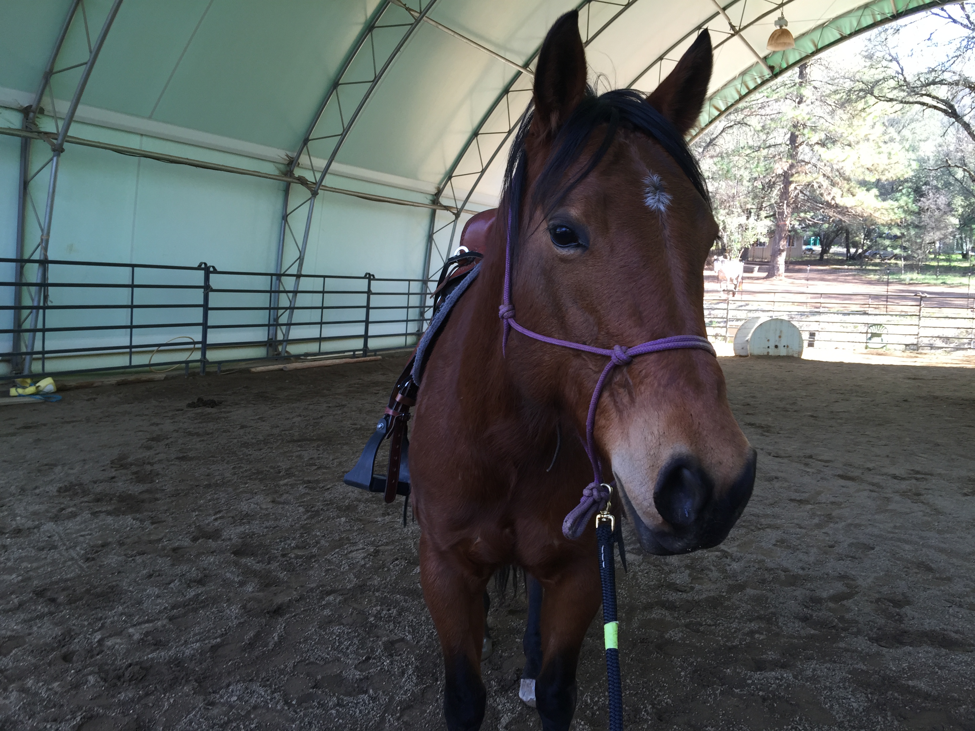 I took Rocky into the arena on Tuesday evening when I “should have” been driving down the mountain for my weekly trip to Silicon Valley. I’d had enough of “shoulds” for that day and had given myself permission, finally, to bring Rocky out and do something with him. I wanted to do something with more purpose and challenge than delivering carrots, grooming, or undemanding time.