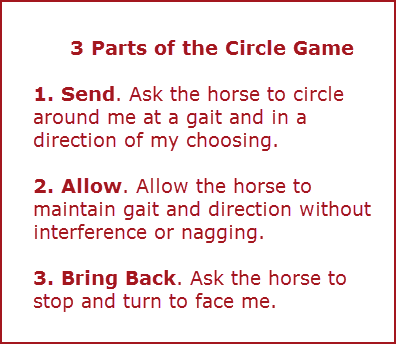 In Parelli level 2, we learn to give the horse a long phase one and then if necessary a quick two-three-FOUR. We also learn about tagging the ground, not the horse, so that the horse has time to move forward and “win” the game by not getting tagged.