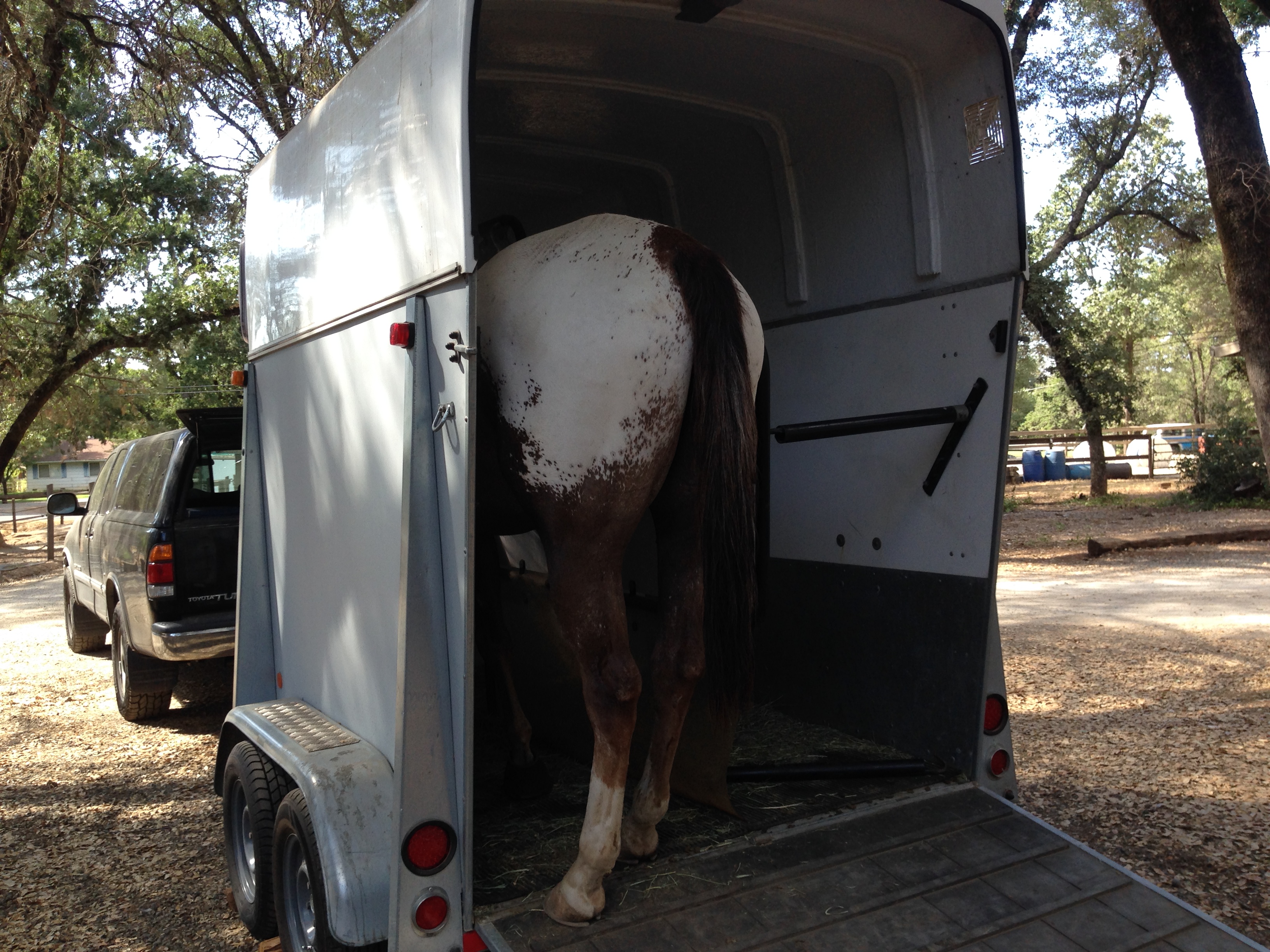 Rocky loaded himself again and this time even went further — because I’d moved the hay bag closer to the front of the trailer and gave him room. I played Friendly Game for a while with the butt bar, rubbing it on him, bringing him out to show it to him, pressing it into his hind end while he was outside, then loading him up again.