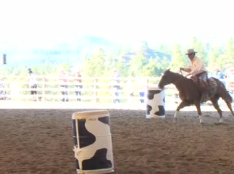 Here is a quickie video I took with my cell phone, to show you the pattern. The production values are horrible but it’s only 35 seconds and you can see how the pattern differs from rodeo barrel racing (while also teaching horses the pattern so they can zip through a rodeo lightning-fast but without panic).