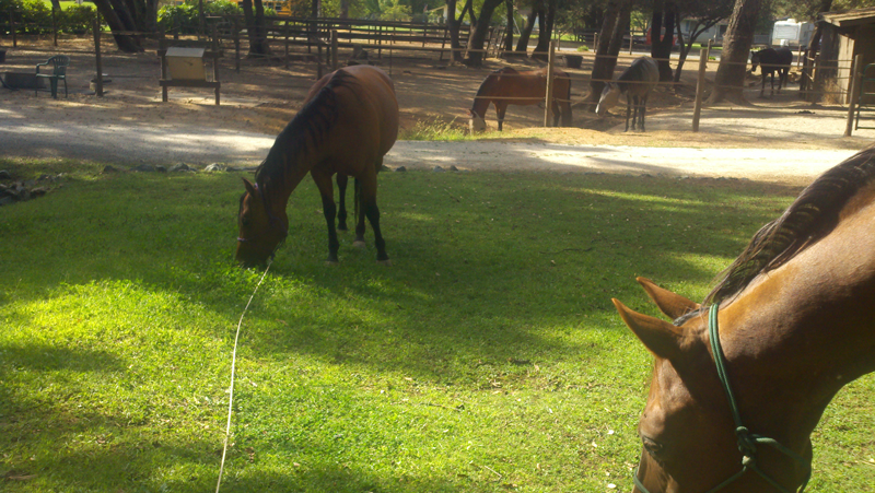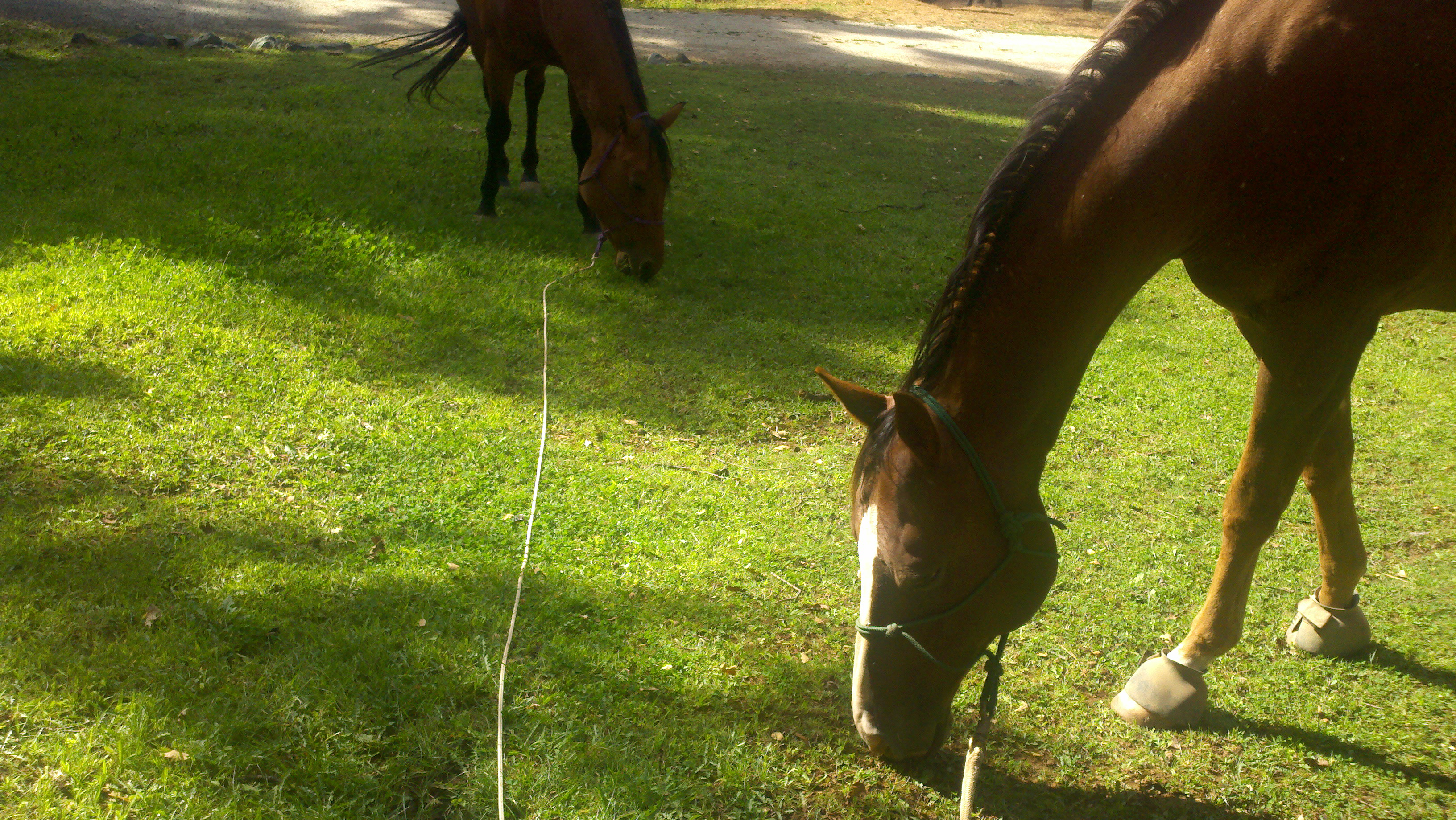I took Rocky and River out to graze together this afternoon. This is a Big Deal, as in the past their close encounters have resulted in insult or injury to Rocky — injury because he got stuck in the fence while trying to get away and she double-barreled him twice before a human could come to the rescue, and insult because she was too close to him on the tie rail while they were being trimmed or shod.