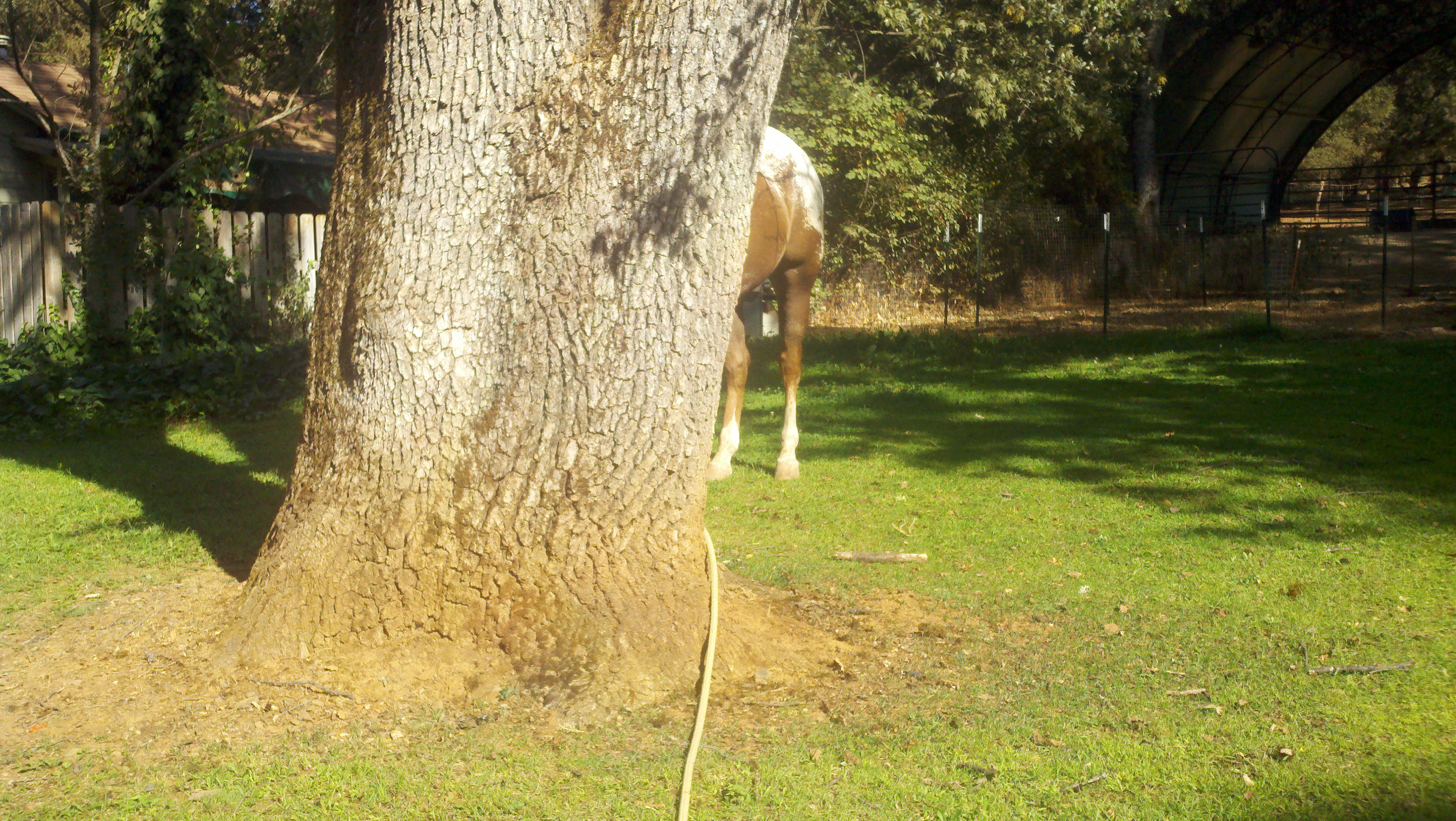 Rocky seemed fascinated by River and wanted to go over to her more than she wanted to go over to him. Eventually he got the idea of playing hard to get, and hid behind the tree. She did glance his way at that point, but River tends to be pretty focused when she’s out grazing.