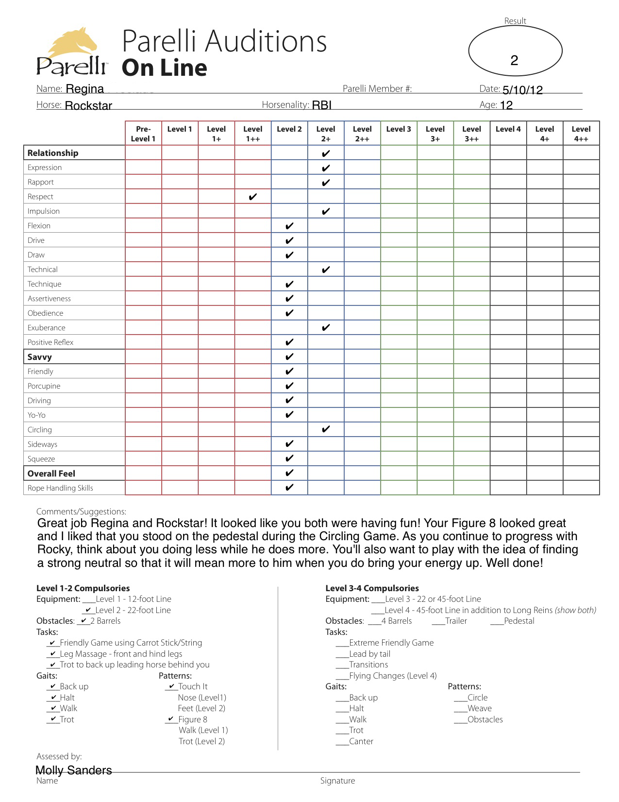The mastery student who evaluated me is Molly Sanders, who is my age and whose horsey background is similar to mine: horse-crazy childhood full of Breyer models and every possible encounter with real live horses, then years without horses, then in her mid-30s getting her first horse and finding Parelli. Somehow this similarity makes me feel even better about my audition — like I have been evaluated by someone who knows. Even though she didn’t know my backstory as she watched the video. Here is her bio on the Parelli Central website.